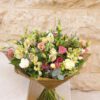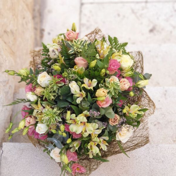 ליזיאנטוס, ורדים, אלסטרומריה וירקים מיוחדים בזר עדין ופסטלי